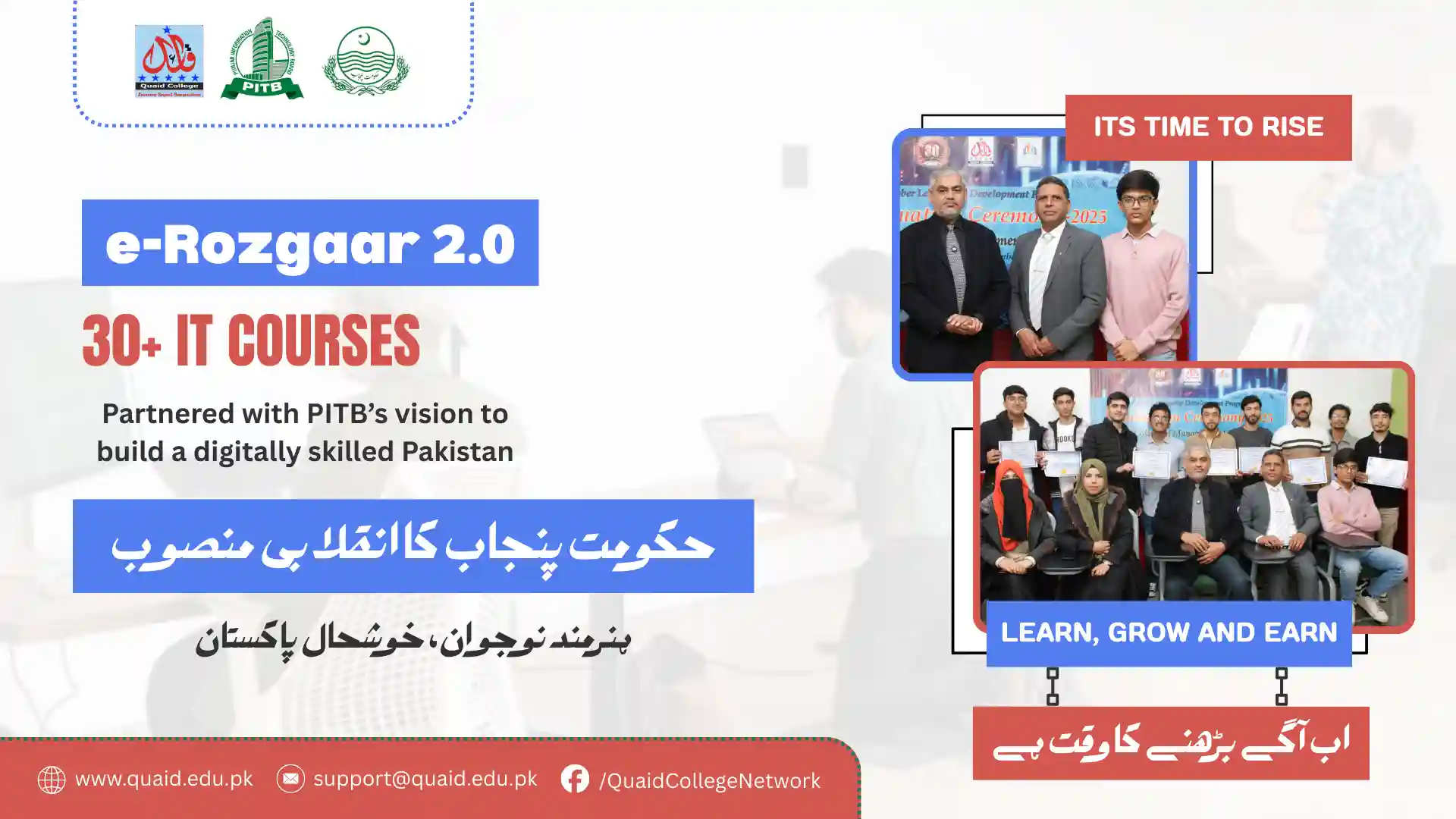Quaid College has joined hands with e-Rozgaar program of the Punjab Government under the auspices of PITB. Through this partnership, our goal is to provide students opportunities to learn hi-tech digital skills and prepare for a bright future. We want to help young people become confident, skilled and ready to find good work opportunities in IT industry. Our IT programs also aim to support the vision of making Pakistan a truly digital nation, where technology creates growth and success for everyone.